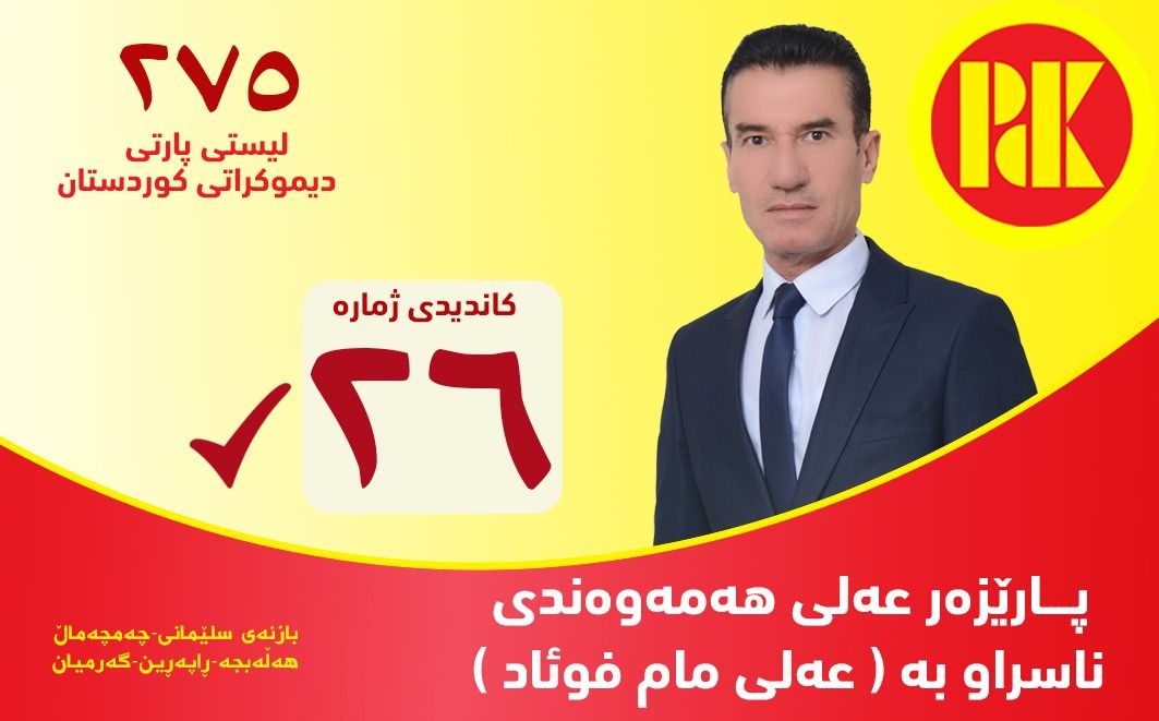پارێزهرعهلی ههمهوهندی ناسراوبه عهلی مام فواد بەربژێری ژمارە(26)ی لیستی 275ی پارتی دیموكراتی كوردستان، رایدەگەیەنێت، هەموو كەسێك هیواكانی لە بەرنامەی لیستی پارتی دیموكراتی كوردستاندایە. پارتی حزبێکە، بە دروشمی ( هاوبهشی هاوسهنگی سازان )تی بە بانگەشە کردووە. دەشڵێت: ”دەمەوێ بە گەیشتنم و بونم بە ئهندامی ئهنجومهنی نوینهران عێراق ، پێشمهرگه ئاسا لهسهنگهری بهرگری نهتهوهكهم ك بم ههربۆیهبەربژێربوون لەسەر لیستی پارتی گەورەترین شانازییە
